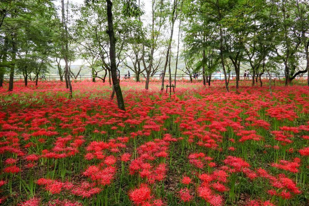 Dans la ville de Hidaka ( préfecture de Saitama) se trouve le parc Kinchakuda au bord de la rivière Korai. A l’aube de l’automne, environ 5 million de lycoris fleurissent dans une magnifique forêt. Le paysage est sublime. Même si le paysage semble rougeoyant, on observe de nombreuses nuances de couleurs.